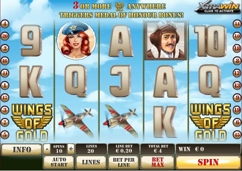 The design in Wings of Gold tries to give you the impression that you’re in a fighter plane in the sky during World War II. You see various types of planes on the reels, you have the pilot, the pin-up model and the line-up is complete with metal made poker cards.