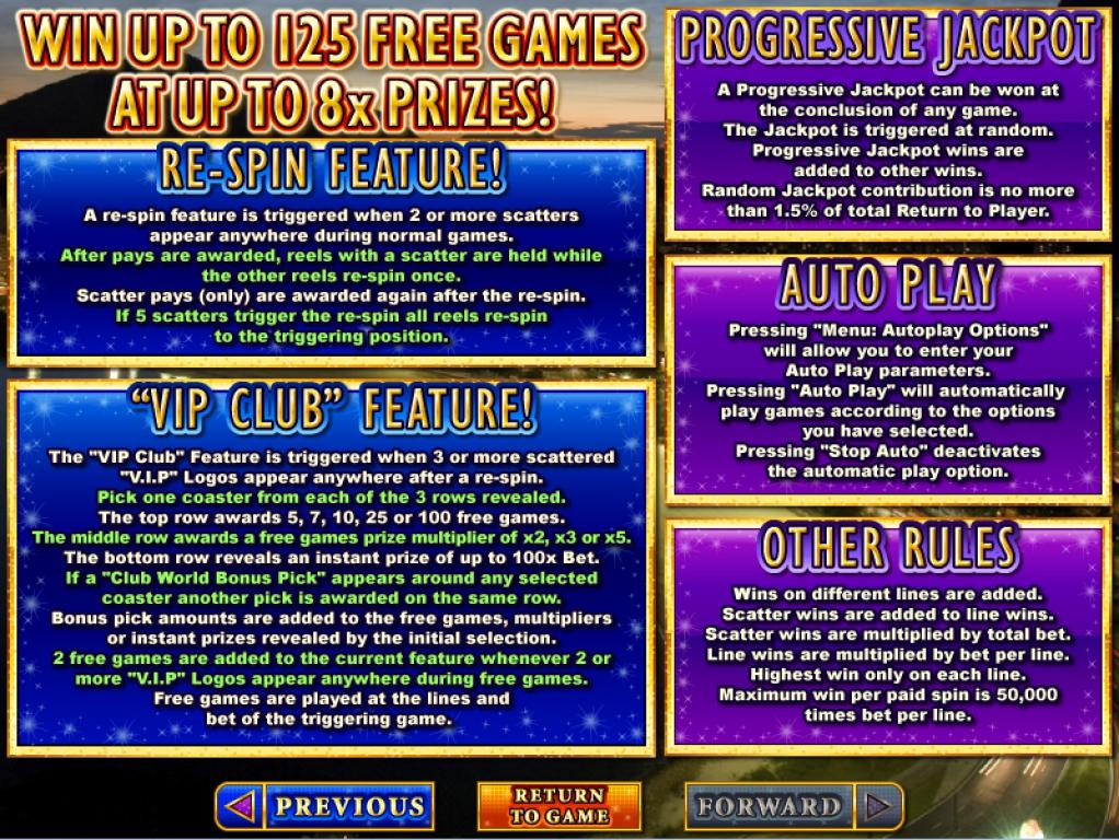 Have two or more scatter symbols appear on the reels in the base game, and a Re-Spin feature will be triggered. The reels which have scatters on them are held, while the others spin once for free. The game offers you again the scatter payouts (without the regular combos). With a bit of luck, you get more scatters than you did originally, and with 3 or more you get access to the VIP Club.