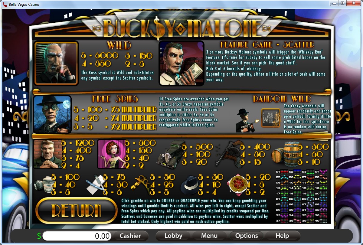 Bucksy Malone is a mafia inspired slot machine, which comes from Saucify (formerly known as BetOnSoft). The era which the game focuses on is the one which is also the most appreciated by players, the time of the prohibition, when Tommy Guns were used, along with retro automobiles, these also being some of the things you see on the reels. The main character here would be a mobster called Bucksy Malone.