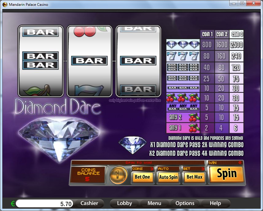 With 3 coins used, you can win the best prize offered in Diamond Dare, which would be at 2,500 coins/$2,500.