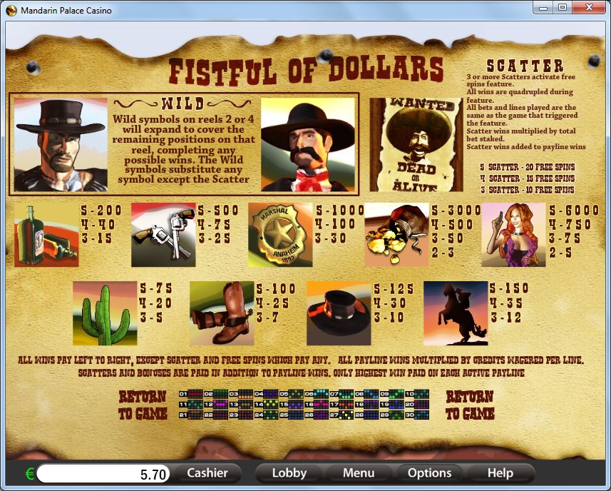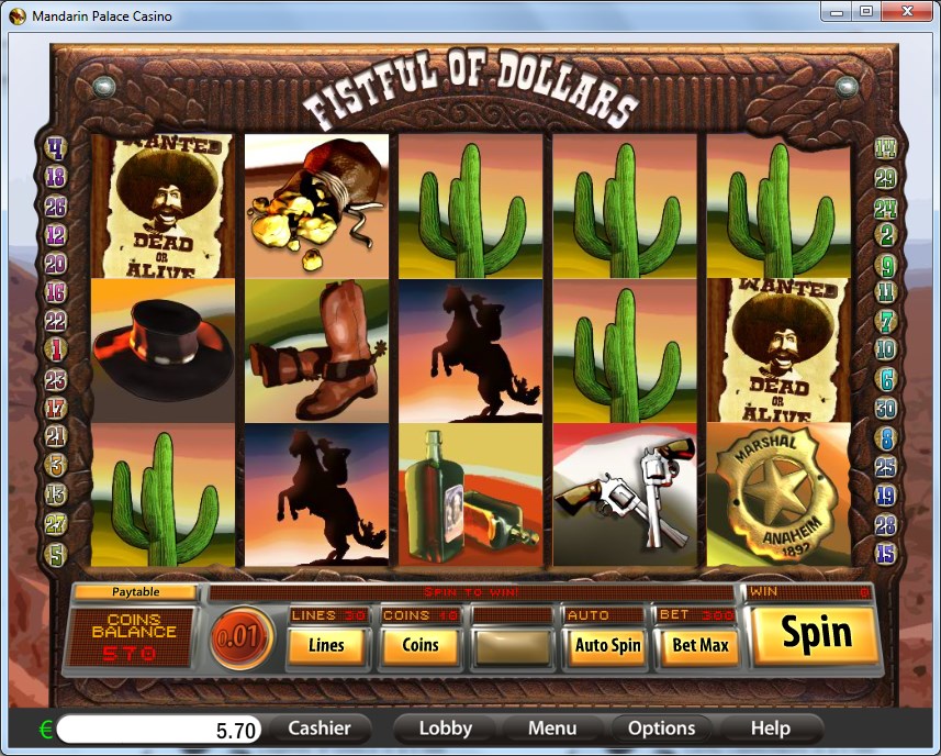 While playing Fistful of Dollars, the bets you place will cover up to 30 bet lines, on 5 reels. The game also presents you with wilds and scatters, along with the obligatory free spins and their 4x multipliers. Top prizes reach $6,000.