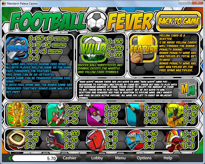 If you take a look at the features of Football Fever, you will find among them free spins, scatter symbols, multipliers, a Penalty Round feature and wilds.