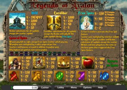 Symbols: Avalon (wild, progressive jackpot), Lady of Lake (150x the bet, scatter), Arthur (800x), Dragon (600x), Crown (500x), Red Apple (400x), Ace (150x), King (100x), Queen (75x), Jack (50x) and 10 (50x).