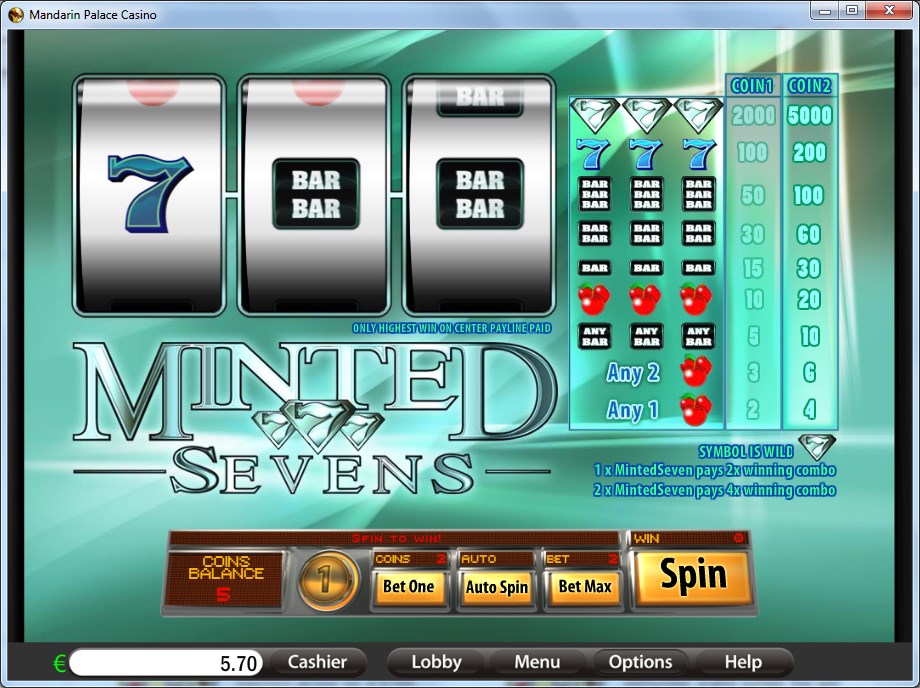 If you look at the paytable info, you will find below it some details about the features available inside and the wild symbol.. There is one symbol which acts in that role, the Minted Seven, and you will notice on the paytable that it also gives the slot’s best prizes if it happens to create its own combo of three icons. You can get paid 2,000 or 5,000 coins by a combo of three Minted 7s, depending on the bet which was placed that round (1 or 2 coins).