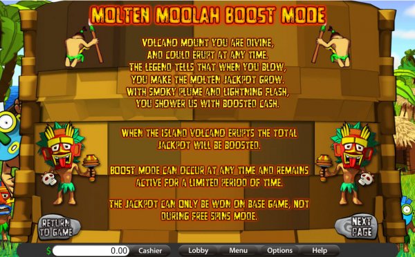 You can get a Boost Mode active as well, but this is a randomly occurring event, without any trigger that you can get on the reels. If you do get it active, you will find that the volcano erupts, and that the total jackpot will receive a boost for a limited amount of time. There is also a very nice poem on the paytable, which tells you what the Boost Mode can do for you.