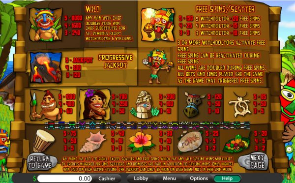 Symbols: Volcano (progressive jackpot), Chief (8,000x, wild), Witchdoctor (scatter, 150x the bet), Warrior (1,000x), Girl (700x), Tiki Idol (200x), Mask (120x), Amulet (85x), Drum (75x), Shell (40x), Flower (30x), Decorated Stone (25x) and Feast (20x).