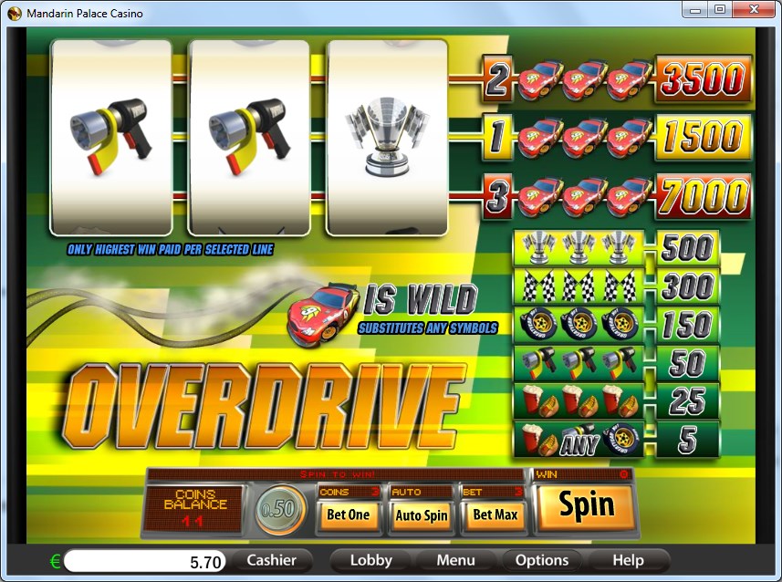 A single feature was introduced in Overdrive, a wild symbol which is represented on the reels by the image of the Red Racing Car. This symbol will form combinations directly, on one of the three paylines, and will pay between 1,500 and 7,000 coins when it manages this. The bigger amounts are offered for the win forming on one of the later lines.