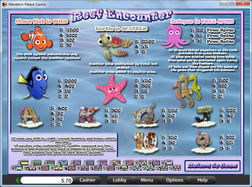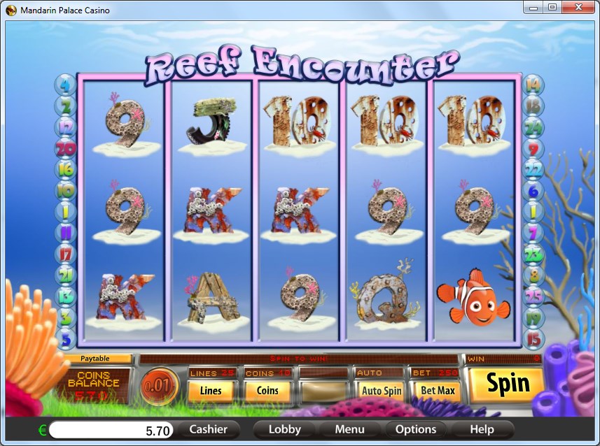 The betting range of Reef Encounter has anywhere between 1 and 250 coins, with total values being between $0.01 and $25. The denomination of a coin reaches $0.10, and since you can use 10 per line, the line bet goes up to $1.