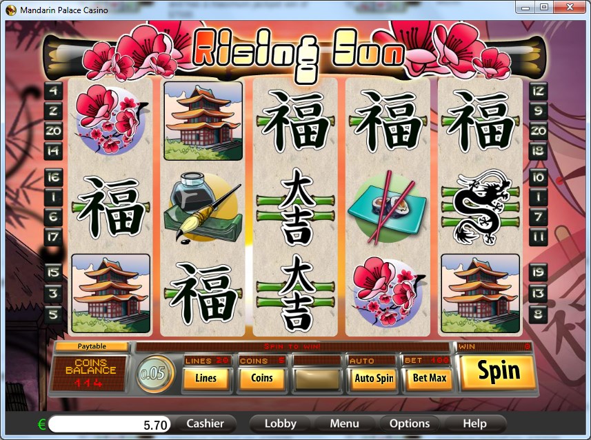 While playing the modern version of Rising Sun, you are going to discover on its 5 reels and 20 lines a list of features which is not very long, but which still manages to give you scatter symbols, wilds and free spins. The best payout advertised is at $7,500.