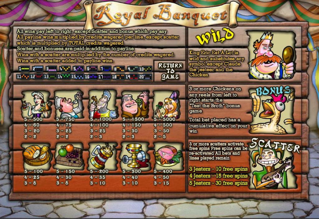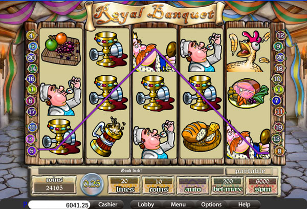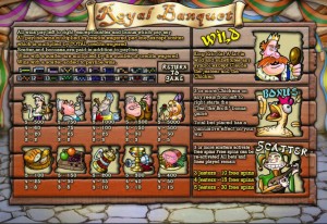 The slot’s 5 reels are occupied by a total of 20 lines. There are bonus games, free spins, a scatter and a wild among the features of Royal Banquet. The top payouts will give you $12,500.