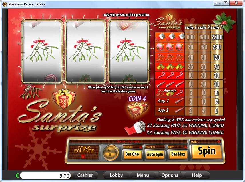 You can win up to 2,500 coins in this game, provided that you wagered 3 coins and you got three Stockings on the payline during the same round.
