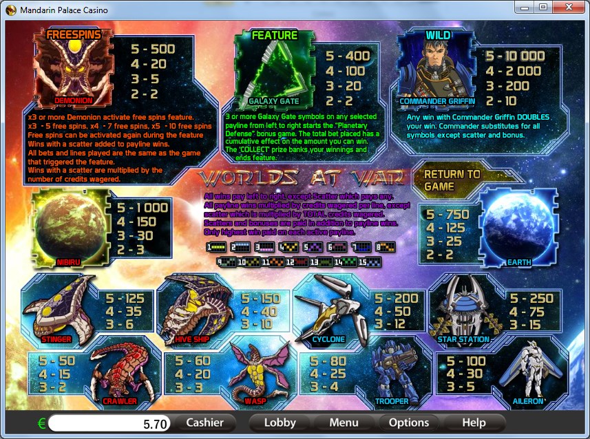 Worlds at War will be a game that the fans of science fiction movies will appreciate immediately. Telling the story of a conflict between humans and aliens, the game has great graphics, with all sorts of cool warriors, alien monsters, space marines and space ships among its symbols. The Universe serves as the backdrop for all this action, and as the paytable teaches us, the two sides of the conflict are Earth and Nibiru. The game was created by Saucify, being one of their few sci fi themed titles.