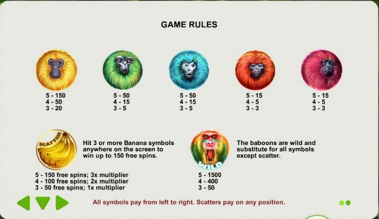 Symbols: Baboon (wild, 1500 coins), Bananas (scatter), Yellow Monkey (150 coins), Green Monkey (50 coins), Blue Monkey (50 coins), Orange Monkey (15 coins) and Red Monkey (15 coins).
