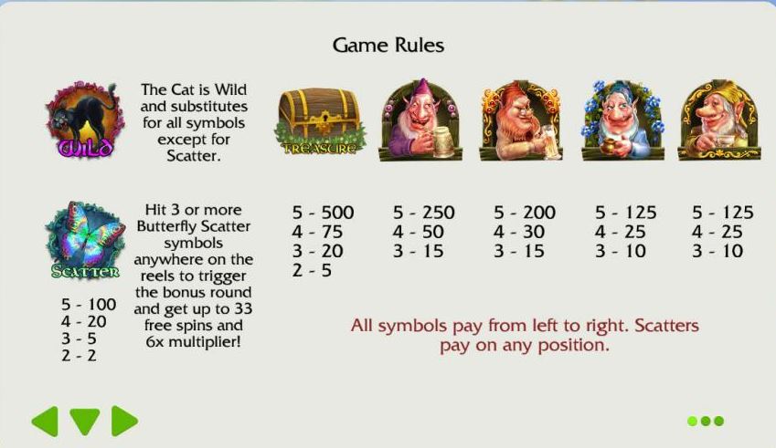 Symbols: Cat (wild), Butterfly (scatter, 100x wager), Treasure Chest (500 coins), Pink Dwarf (250 coins), Red Dwarf (200 coins), Blue Dwarf (125 coins), Yellow Dwarf (125 coins), Ace (100 coins), King (100 coins), Queen (75 coins), Jack (75 coins) and 10 (75 coins).