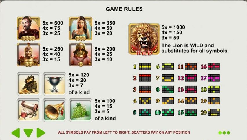 Symbols: Lion (wild, 1,000 coins), Golden Chariot (scatter), Roman Emperor (500 coins), Roman Woman (350 coins), Roman Soldier (250 coins), Gladiator (200 coins), Money Bag (120 coins), Wine Cup (120 coins), Paper Scrolls (100 coins), Horn (100 coins) and Grape (100 coins).