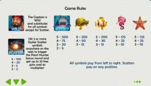 The Oyster with the pearl in it is another major feature of the game. The symbol is a scatter, so it is capable of appearing in any position, not necessarily on a fixed payline. You need a minimum of two such symbols to obtain a prize, and at least three for the bonus round. The prizes for 2, 3, 4 or 5 scatter symbols are at 2x, 5x, 20x or 100x the bet value, respectively.