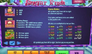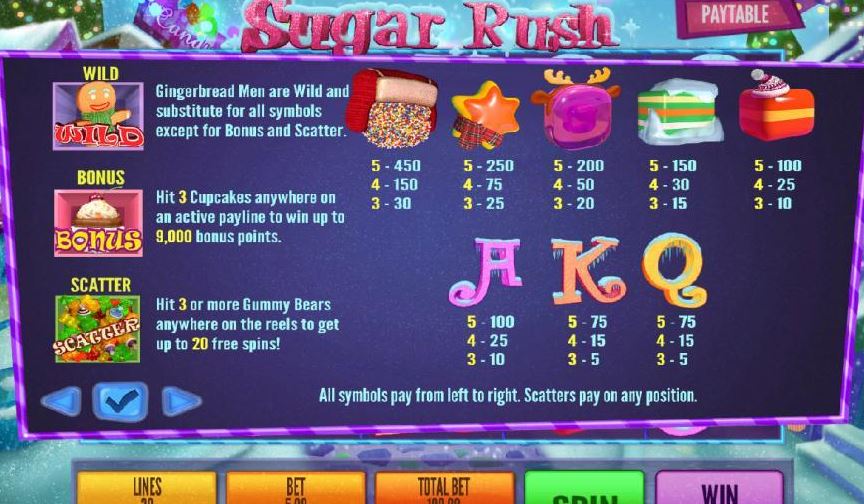 Like all Sugar Rush slot machines, it has 20 lines and requires bets of up to $5 per line, though you can get away with as little as $0.01. The maximum bet allowed inside is worth $100.