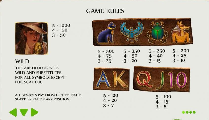 The Archeologist symbol is used as a top jackpot trigger and as a wild feature. As the top jackpot symbol, if it appears on up to five positions of a payline it rewards the player with up to 1,000 coins. As a wild, even a single symbol can be of use to you, since it will act as a substitute and hopefully bring you wins that wouldn’t have been possible without its help. Wilds of this type can’t replace scatter symbols, but all other symbols are fair game.