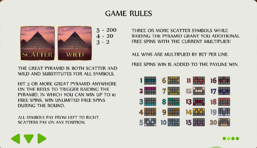 The slot’s bonus game brings you free spins, up to 10 of them, along with multipliers. To get inside, you have to first get a minimum of three Pyramid scatters on the reels, and in the same round.