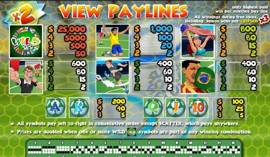 30 win lines are part of the 5 reels in Super Soccer. There are a lot of things to be impressed with, from the wild symbols which have multipliers, to the scatters, bonus games and the free spins (also with multipliers). On top of that, a top prize of $250,000 can be won while playing this game.