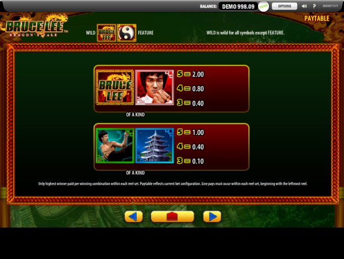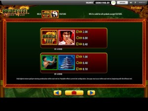 The wild symbol is represented on the reels by the Bruce Lee Logo, with the golden dragon behind it. This symbol forms combinations which pay up to 200x the line bet, and it also is useful because if it lands where it’s needed you can get a new combination formed, the wild being able to substitute for any regular icon.