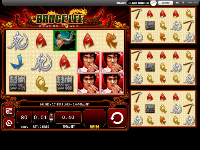 The thing that will get your attention immediately is the use of the four slot machines in a single one, all of them being visible on the main game screen. The first slot takes about 60% of the screen, while the other three are crowded on the remaining 40%. The symbols are poker cards in a Chinese lettering style, or images of Bruce Lee and related icons.