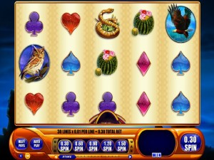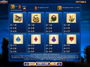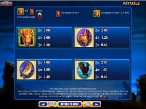 Symbols: Buffalo (wild, 500 coins), Full Moon (scatter), Fox (200 coins), Owl (200 coins), American Eagle (200 coins), Lizard (150 coins), Snake (150 coins), Cactus Fruit (100 coins), Flowers (100 coins), Spade (75 coins), Diamond (75 coins), Clubs (50 coins) and Hearts (50 coins).
