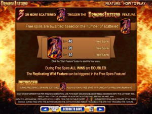 Two types of wilds exist on the reels of Dragon’s Inferno. There is a regular one, and then there is the replicating wild. The free spins are the other part of the features that are offered.