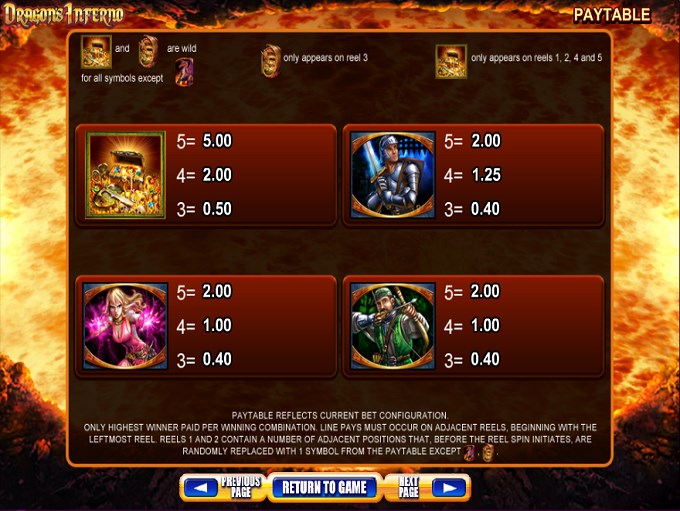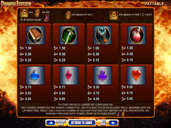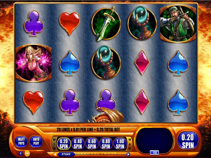 Dragon’s Inferno is a slot machine from WMS, where the action takes place in a land where dragons exist and where humans are using swords, bows and magic to fight them and the inferno they can bring upon their settlements. The game and its fantasy heritage aren’t that new, plenty of other titles being on the market with a similar topic. Fire breathing dragons seem to be a fascinating topic for slot developers everywhere, though they’re rarely the main focus of the story, like they are here.