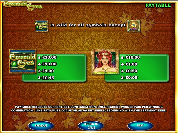 Once Emerald Eyes has loaded, you’re going to find that the slot has 5 reels and on them up to 20 paylines can be active. Give the game a chance, and while you play you will find re-spins, scatter symbols, wilds and free spins. You can even win prizes of up to $15,000.