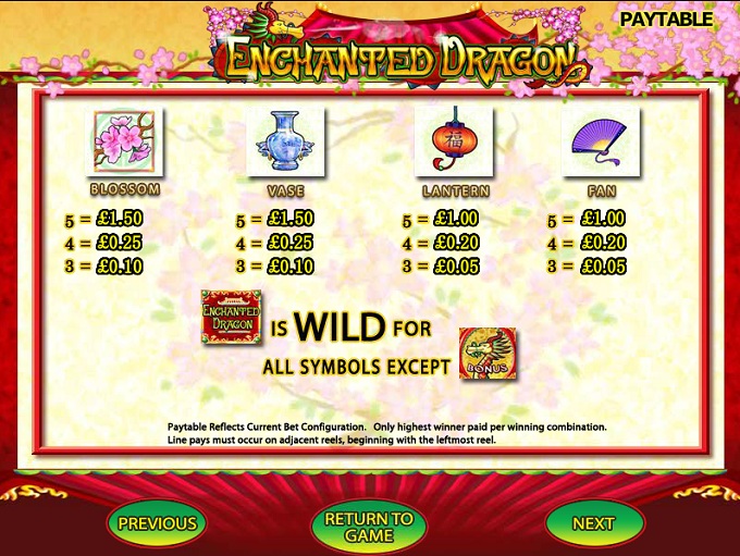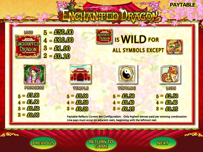 Symbols: Enchanted Dragon Logo (wild, 5,000 coins), Dragon (scatter, 100x total bet), Princess (700 coins), Temple (500 coins), Yin Yang (250 coins), Lion (250 coins), Cherry Blossom (150 coins), Vase (150 coins), Lantern (100 coins) and Fan (100 coins).