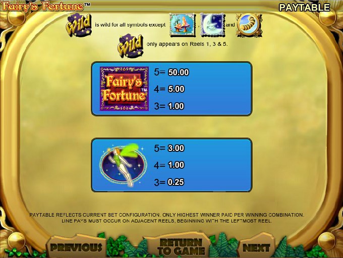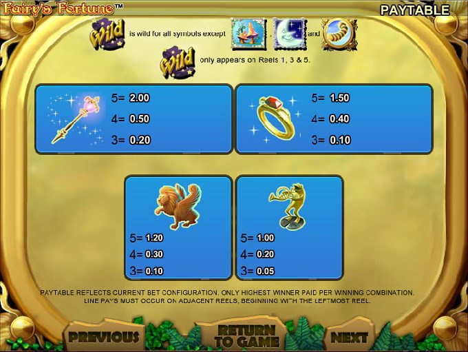 Symbols: Wild Logo (wild), Toadstools (scatter), Moon (scatter), Caterpillar (bonus), Fairy’s Fortune Logo (5,000 coins), Fairy (300 coins), Wand (200 coins), Ring (150 coins), Winged Lion (120 coins) and Singing Frog (100 coins).