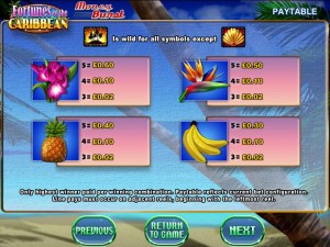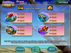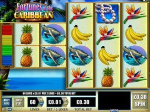 Playing Fortunes of the Caribbean gives you access to a slot machine with a tropical tropic, a very pleasant looking game with clear blue waters, turtles, fruits and overall, just the kind of title that you want to spend time with when you’re aching for a nice long vacation. Designed by WMS, it seems to have the right graphics, but let’s see how it does with the features that it offers as well.