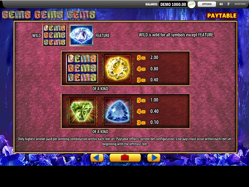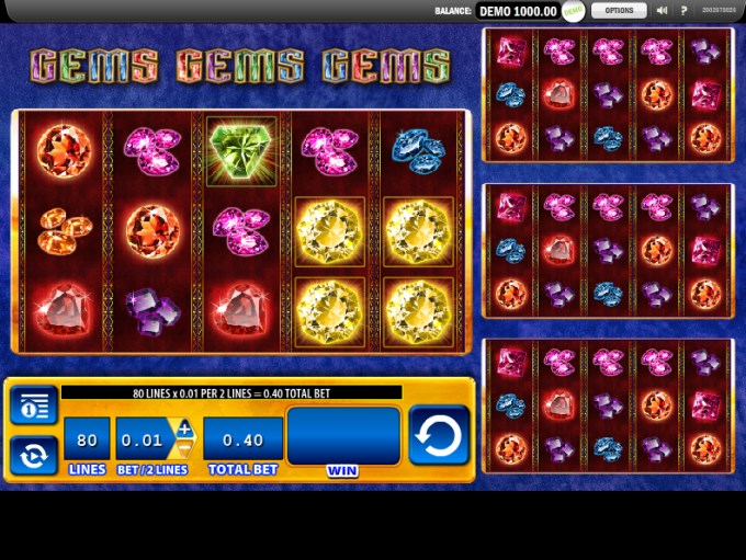 Gems-Gems-GemsThe game’s theme is not hard to figure out, not with a title like Gems Gems Gems screaming it at you. Designed by the guys from WMS, it is a slot machine with a gemstone theme, but it’s also unusual because of the layout which it works with. It has one major set of reels with 20 lines on the left, with three others on the right side of the screen. It’s not the only slot of its kind, WMS actually has others with the same gameplay style.