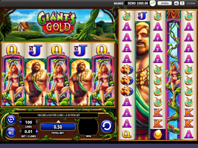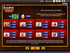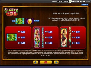 While using two different sets of reels, one normal, the other colossal, Giant’s Gold manages to give you up to 100 paylines. On them, symbols can be stacked, can include wilds, scatters and can bring you free spins with multipliers. It sounds great so far, so naturally there is a downside as well, the top prizes which only reach $1,000.