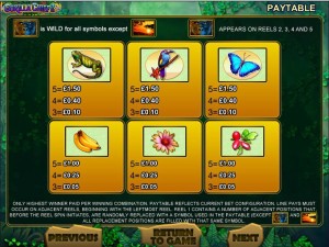 It has an attractive design, with a fire like border surrounding the reels, probably thanks to the Hot Hot Penny feature which can get activated. The reels themselves are mostly in a light green, with various images of insects, birds, animals and plant life being presented on them. The background image shows off a waterfall image, with the surrounding jungle visible a bit as well.