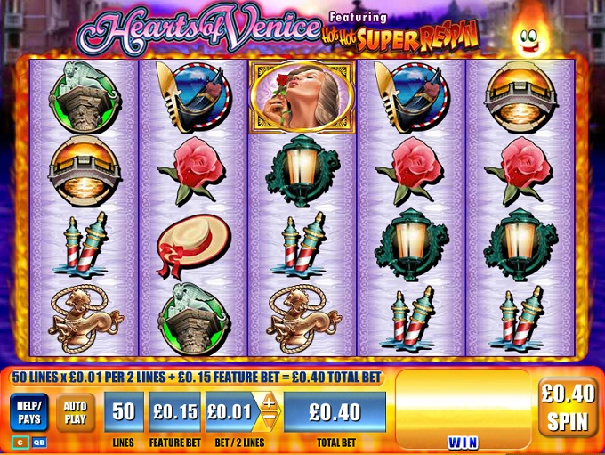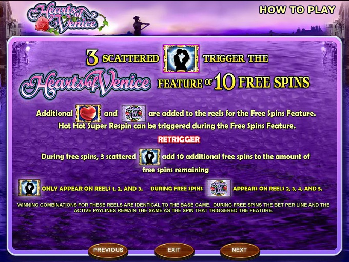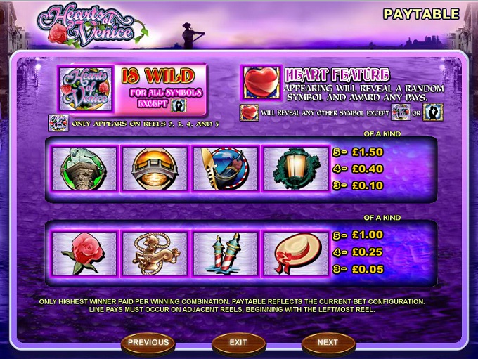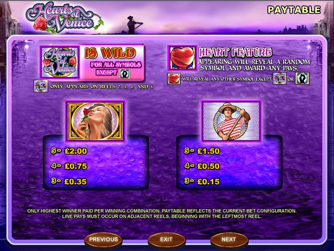 The options that Hearts of Venice puts forward include the ever popular wild, the bonus random Heart, the Couple scatter and the resulting free spins that it brings along.
