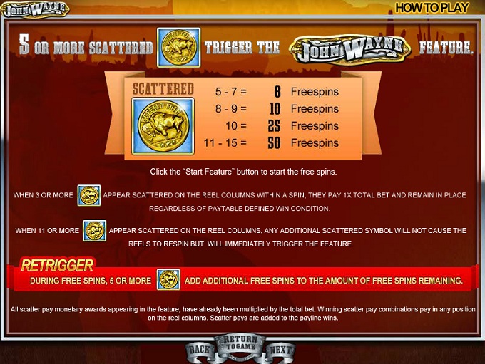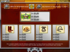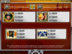 The wild’s image is that of the John Wayne Logo. Present on the 1st, 3rd and 5th reels, the wild Logo is going to be useful only as a symbol that brings you more wins, by substituting for the symbols which are needed. There are no prizes offered directly by it, and no multipliers to apply to the wins, so it’s a very basic wild feature.