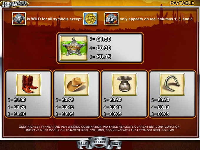 Symbols: John Wayne Logo (wild), Buffalo Coin (scatter), John Wayne Close-up (500 coins), John Wayne Riding (500 coins), Safe (250 coins), Six Shooters (200 coins), Sheriff Badge (150 coins), Boots (100 coins), Hat (75 coins), Spit Bucket (60 coins) and Horseshoe (50 coins).