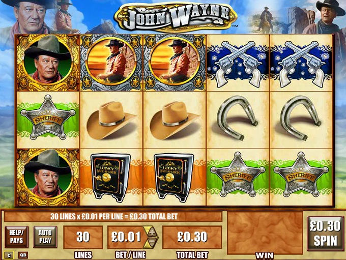 The game’s Wild West heritage is easily visible. It’s also a John Wayne themed game, so you’re going to see photos of the actor in a couple of symbols and in the logo area. The background image shows off an image of the prairie. Other symbols chosen for the game include things like safes, sheriff badges, horseshoes or hats.