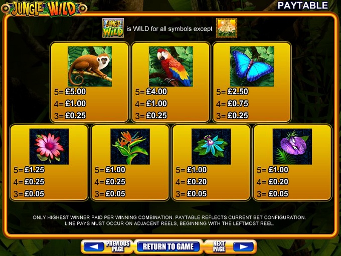 Symbols: Jungle Wild Logo (2,500 coins, wild), Temple (scatter), Gold Idol (750 coins), Gold Idol #2 (750 coins), Monkey (500 coins), Parrot (400 coins), Butterfly (250 coins), Pink Flower (125 coins), Red Flower (100 coins), Blue Flower (100 coins) and Purple Flower (100 coins).