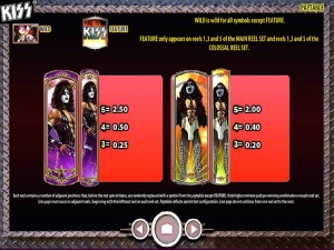 The KISS Logo is the feature icon, the scatter of the game. Both sets of reels can get this symbol on the 1st, 3rd and 5th columns. When this scatter appears on all three reels of the same slot machine, you get a choice of backstage passes. You can get the free spins, the band prize or a picking feature.