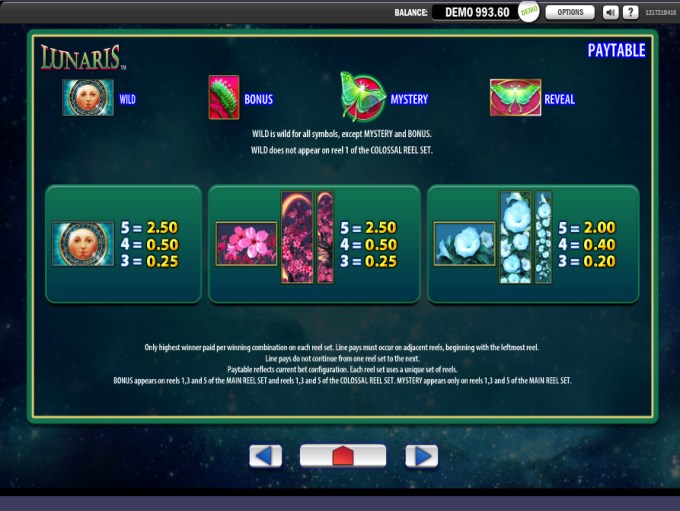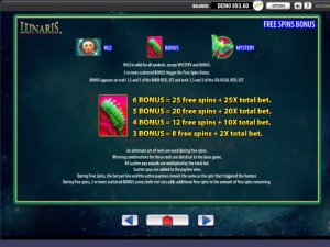 Lunaris has two sets of reels, each one with 5 columns. The total number of paylines reaches 100. Mystery features, bonus games, free spins, scatters and wilds are all present inside. As for the big prize, it’s $1,250.