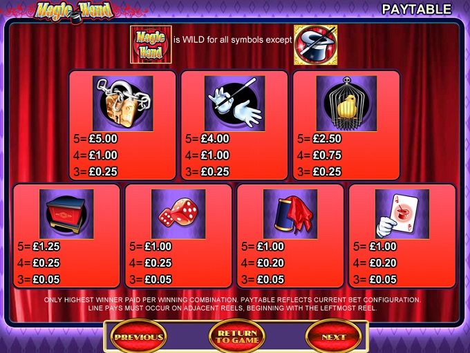 Symbols: Magic Wand Logo (2,500 coins, wild), Magic Hat (scatter), Magician (750 coins), Blonde Assistant (750 coins), Locked Chain (500 coins), Magic Hands (400 coins), Caged Dove (250 coins), Box (125 coins), Dice (100 coins), Handkerchief (100 coins) and Ace Card (100 coins).