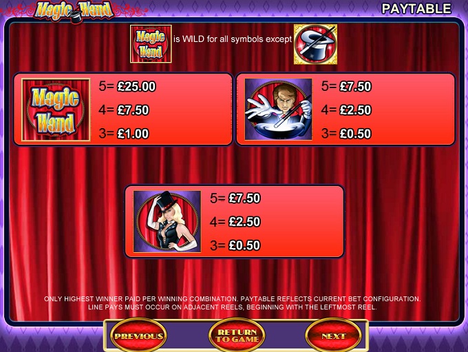 The action in Magic Wand takes place inside the hall where the magic show is held. You see the red velvet curtains behind the reels. The reels are purple and they have a diamond like pattern on them. Symbols are 100% themed and chosen well for this slot machine, with magicians, the lovely assistant, various magic tricks and accessories being part of them.