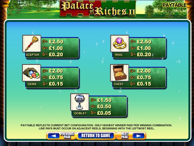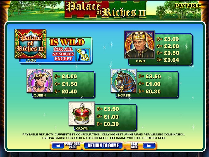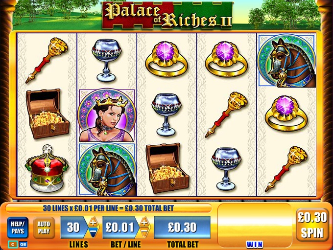 5 reels are used in Palace of Riches II, with 30 paylines available. The feature list includes a lot of free spins, scatter symbols and the usual wild. As for the prizes, they reach a top value of $2,500.
