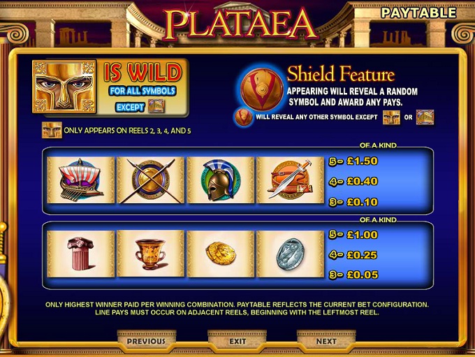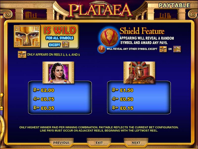 A total of 50 paylines are part of the 5 reels of Plataea. Among its features there is the Shield feature, wild symbols, a scatter and free spins. The top prize of only $1,000 is a very small reward in exchange for the big wagers that you have to use.