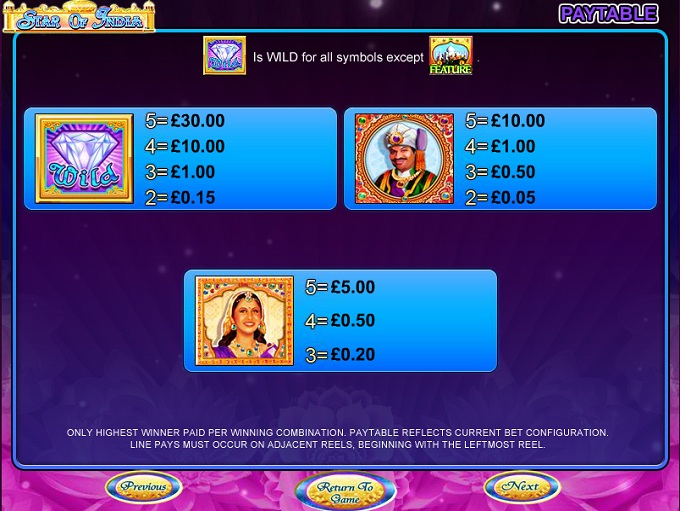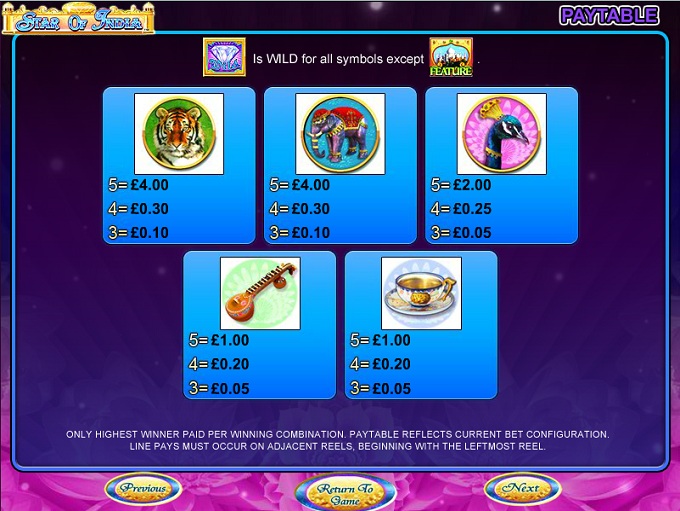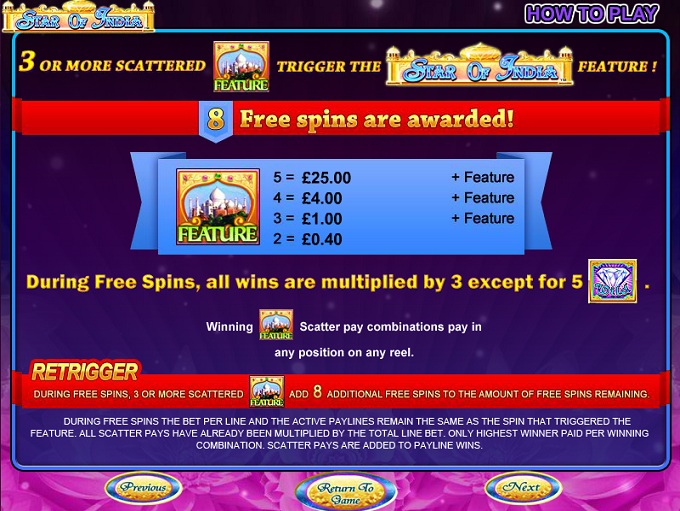 While playing Star of India, you can expect to come across wild symbols, scatters and features with free spins and multipliers which will triple payouts.