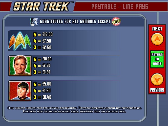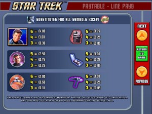 Trekies that give this game a chance will discover that it has 25 paylines and some very interesting features, including bonus games, randomly triggered events, scatters and wilds. The top prize will give you $4,500.