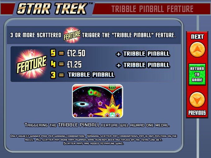 You will recognize the scatter symbol by the red explosion taking place on it and by the fact that it has the word Feature written in the front of it. Have enough of these scatters present, no matter what their position is, and you can expect a payout of 5x to 50x the wager (four or five symbols), or the Tribble Pinball feature (3 to 5 scatters).